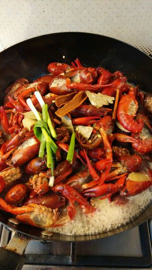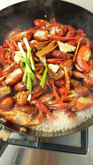 油锅将油烧热,下葱姜蒜花椒辣椒爆香后,放入洗净小龙虾翻炒至龙虾全部变红色;