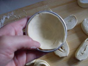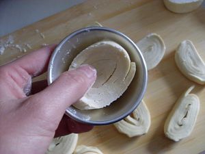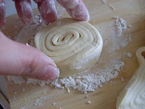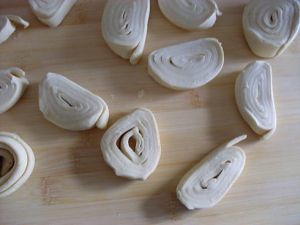将擀成0.3CM厚的千层酥皮卷起来,放入冰箱冷藏30分钟。 冷藏好后的千层酥皮卷,拿出来切成大小均匀的小卷。(我切的这个实在是有些不匀哈,大的大,小的小的)