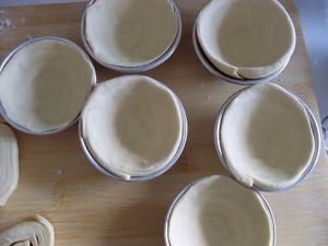 面团沾点水,在模子里慢慢推高推薄至模子边缘;