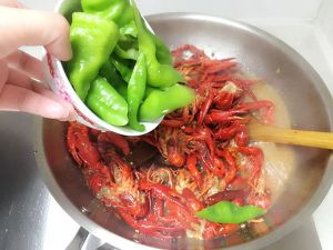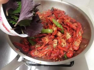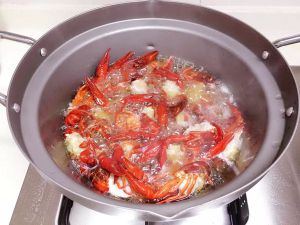 炒锅内下油和豆瓣同炒出红油,加入桂皮、花椒、姜片、大蒜片、干辣椒、朝天椒,炒出香味之后倒入小龙虾翻炒均匀。