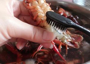 捏住尾部三片尾巴中间的小尾巴,转动半圈拉出,去虾尾部的沙线。然后要拿刷子刷虾的腹部,2斤的小龙虾我刷了约20分钟