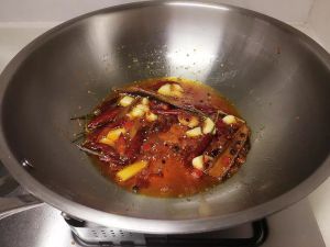 多放油,放入花椒大料干辣椒,郫县豆瓣,葱姜