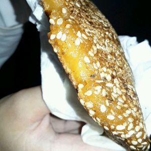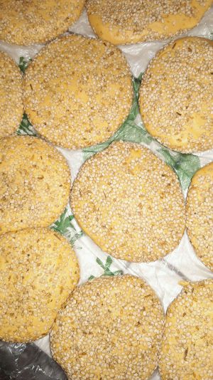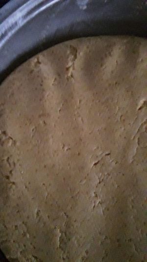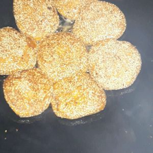 面团揉成团放芝麻里滚一圈用手揉实拍成均匀的面饼。 面团里也可包裹豆沙或糖面粉里就不用加糖了,我嫌麻烦直接加面粉里了也很好吃