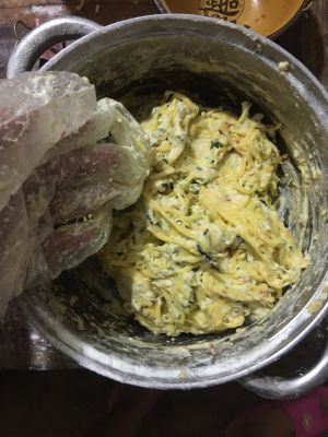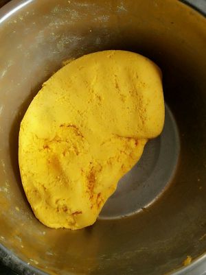 把糯米粉用开水搅拌成絮状,加入南瓜泥。
