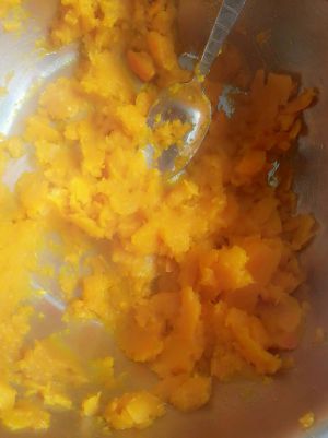 南瓜切块。入锅,加盖中火煮。加一点水。大约20分钟,南瓜变软,用铲子压碎,加糖。开盖大火煮至近无水。