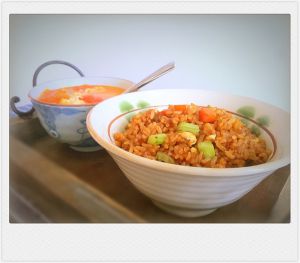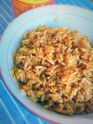 米饭,最好是隔夜饭哦,加入少许生抽,适量的味极鲜(注意不是美极鲜哦!)拌匀,尽量使每一粒米饭都过上酱油。(其实如果光是炒蛋炒饭也可以事先把米饭裹上蛋液拌匀,这样炒出来的米粒会个个金黄)