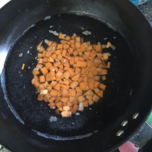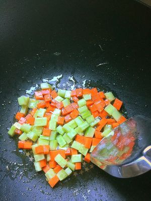 第六步:放入葱花爆香,放入胡萝卜、黄瓜。