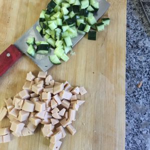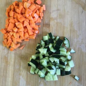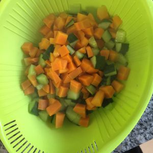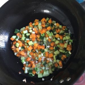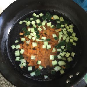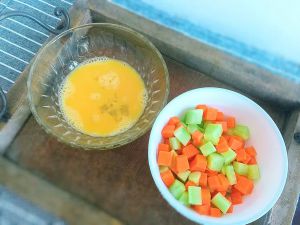 蔬菜里切成小丁(可以加入任何自己喜欢的蔬菜以及肉粒,我这次只用了胡萝卜和黄瓜,我们常州正宗的酱油炒饭是要加常州萝卜干的,可惜家里没有)鸡蛋打散,备用。