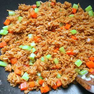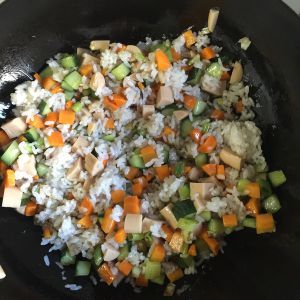 热锅里再放入少许油,倒入蔬菜里稍翻炒,蔬菜断生便可加入米饭。