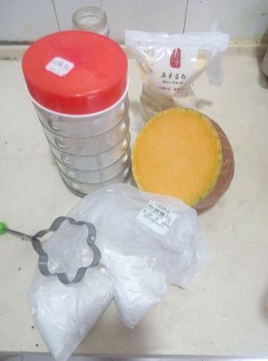 把南瓜放在大点的盆内,撒上一汤勺糖粉,捏成南瓜泥。