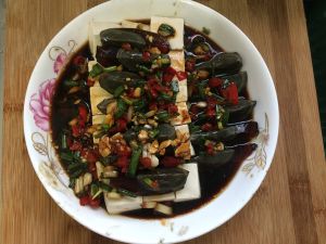豆腐出锅,把皮蛋切小半圆形然后摆在豆腐上。