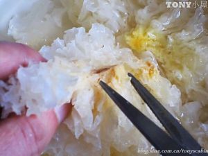 浸泡完,银耳去黄蒂,剪成丝,洗净。