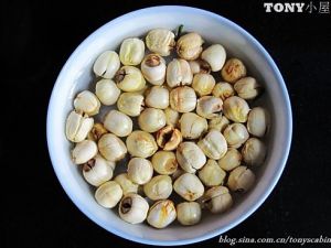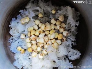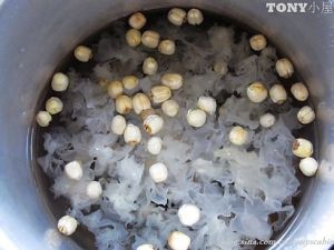 银耳,莲子依次倒入电饭锅,加入适量的水,再加入少许冰糖,按电饭锅煲汤键,自动煲汤。