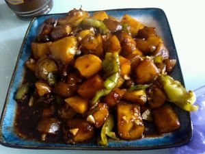 把茄子,土豆,放入翻炒,再加入刚才调的酱汁,翻炒均匀即可