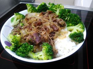 肥牛片解冻,葱头切片,西兰花焯水,米饭煮好。