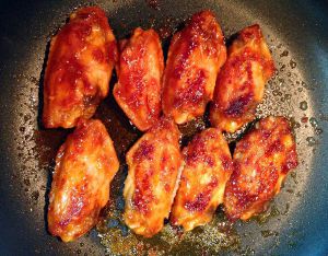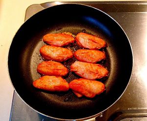 平底锅里薄薄铺上一层油,小火,将鸡翅放入锅中。