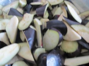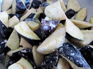 茄子切滚刀块,并用盐杀出水