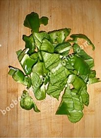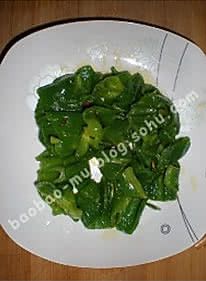 捞出土豆片迅速放入青椒块,利用锅内余温将青椒块炸软。
