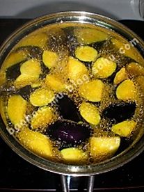 再将茄子倒入油锅,炸至金黄色,加入青椒块即一起捞起;
