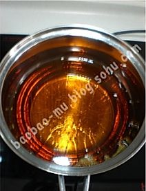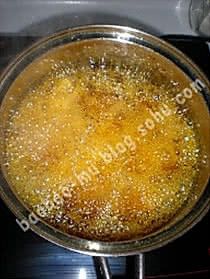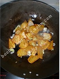 锅中倒入多一些的油,七成热时,先将土豆块放入,炸成金黄色,略显透明时捞出备用;