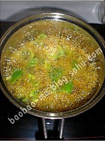 以少量热油爆香葱花及蒜茸, 加高汤、生抽、糖、盐、茄子、土豆和青椒块 略烧;