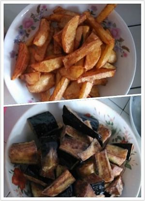 土豆下锅翻炒,变色出锅备用,用余下的油炒茄子。