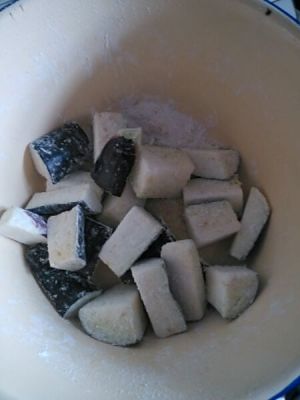 土豆去皮。滚刀切,泡冷水。茄子也一样滚刀切,切好撒上面粉,抓拌均匀,青椒切菱形块。
