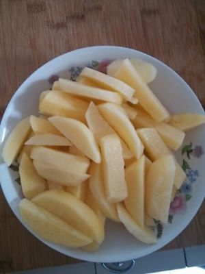 锅中倒入油,油温达到时加切好的土豆,炸至金黄即可。(泡过的土豆擦干在下油锅哦)