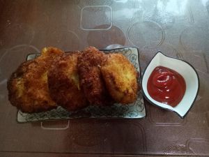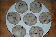 把蒸好的土豆用勺子打成泥~把炒好的胚根洋葱加入~加黄油适量~牛奶适量~胡椒粉~糖~鸡粉~盐适量~把这些都搅拌均匀~做成大小一样的小饼~