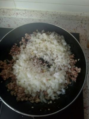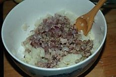 热锅下油,油热后放入洋葱,肉沫炒香后倒入土豆泥里。加盐,少许黑椒粉提味后拌匀。