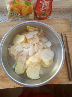 土豆很大一个,切厚片,煮熟。最好不一样厚,有些很沙有些有点脆增加口感层次。煮完土豆顺手稍微焯一下玉米粒。