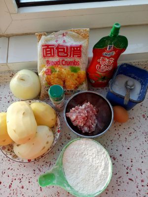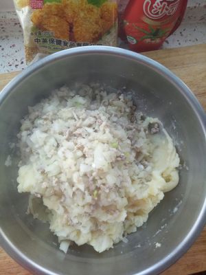 土豆去皮切片放微波炉叮熟后压成土豆泥。洋葱切末备用,肉剁成馅。