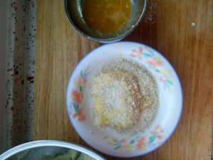 然后把鸡蛋打成蛋液~做好的饼~拍上一层面粉~在裹上鸡蛋液~最后滚上面包糠~油烧到5成热的时候~下入可乐饼炸制~待定型后~稍微加热油温~在冲炸一下~待成金黄酥脆后~捞出~可沾番茄沙司或照烧酱吃