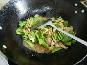 把四季豆焖熟后倒入刚炒好的猪肉,翻炒一下,再加入少许蚝油还有一点点大曲酒增香一下。再把它翻炒均匀盖上锅盖焖上一两分钟就了以出锅了。