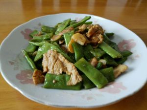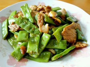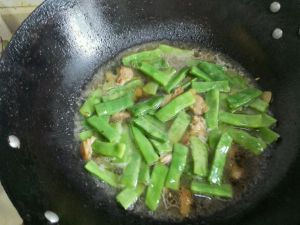 锅内放进蒜片,大火炒香,再下进四季豆和肥肉一起翻炒。