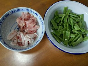 新鲜四季豆浸泡洗净后,去掉两头,摘除经络,掐成合适的小段。五花肉要有肥有瘦的那种,如果没有,可另拿一小块瘦肉,两者都切成薄片,分开放。大蒜剥皮切片。