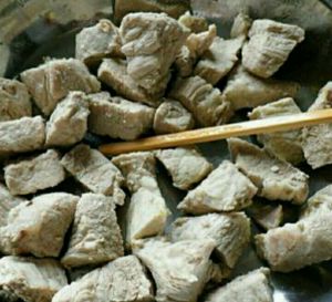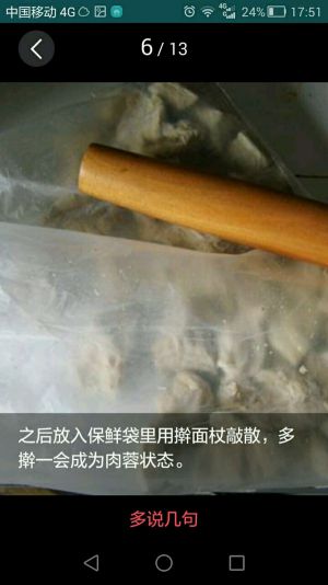 取出的肉块沥干水份,放入保鲜袋中,用擀面杖敲散。(肉趁热敲很容易敲散,不要等凉透了再敲)