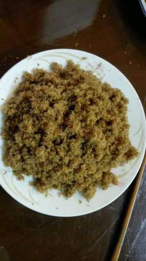 锅中倒入一勺油,然后将肉丝均匀地铺在锅中,将火调至最小,翻炒中加入盐、生抽、料酒、白糖,继续不断翻炒,肉丝中的水分会慢慢蒸发掉,约30分钟后肉丝越来越干并蓬松,颜色金黄即可出锅。