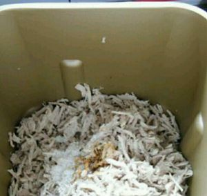 敲散的肉细条放入面包机内胆,加入所有调味料,略拌匀。