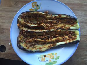 茄子洗净切半.用刀划几个口子这样比较容易入味,撒点盐腌五分钟甩掉水.在茄子表面刷一层橄榄油或色拉油.放入烤箱150度烤5-10分钟