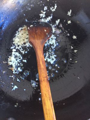 大蒜剁碎油锅爆香,加盐,孜然粉,辣椒面关火搅匀。