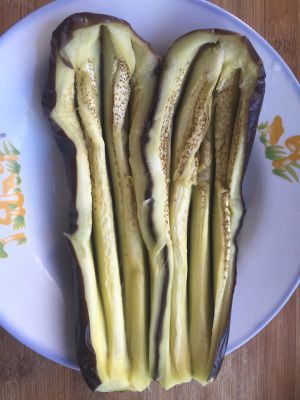 长茄子洗净,放微波炉中高火2分钟叮软,用小刀划出一道口。