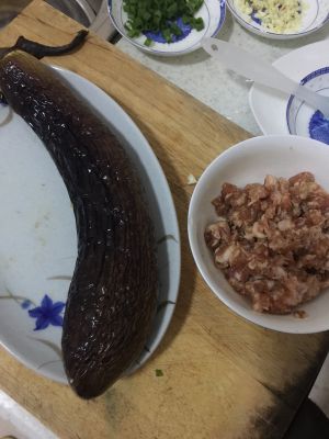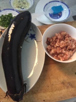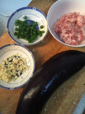 烤茄子的过程中来准备配料,肉切末,蒜、姜切末,青椒或辣椒切丁。