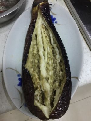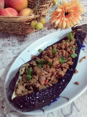 烤好的茄子软烂,肉末的汤汁渗入茄子中。