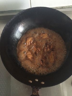 倒入可乐加入适量盐可以盖上锅盖大火炖煮 最后改成小火收汁