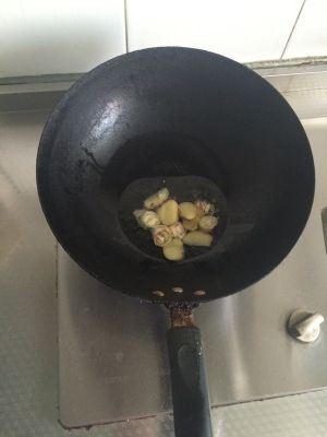 锅内放入少许油放入姜、蒜、小辣椒进行翻炒