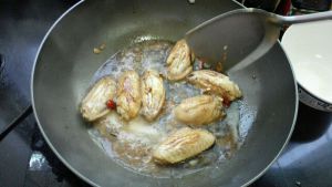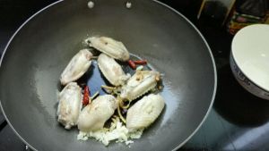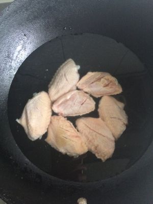 锅里放入油 少一点 因为鸡翅会出油 健康么 呵呵 放入花椒大料 出香味后 改小火放入葱姜 爱吃辣可以辣椒 小火为的是不糊and不使劲溅 待出香味后 鸡翅入锅