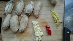 鸡翅焯水捞出,姜、蒜切碎也可以放个小辣椒提味