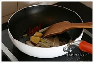 准备好这些,盘子里先下锅炒香,然后放红辣椒