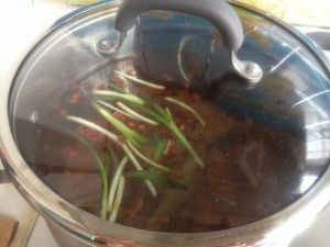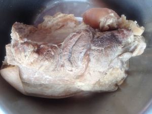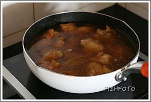 然后加水至猪蹄齐平,倒入酱油和料酒,煮沸,全部倒入高压锅,压20分钟